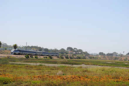 Pacific Surfliner 768 at the San Elijo Lagoon. From here we fought heavy traffic on Interstate 5 to Oceanside Harbor Drive to Harbor Drive South, then went under the mainline to a free parking lot east of the tracks. We walked out onto the north riverbank of the San Luis Rey River and set up.
