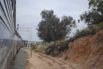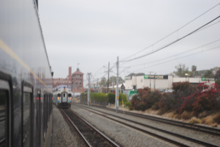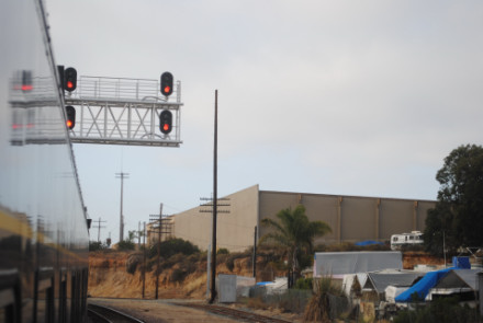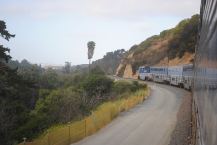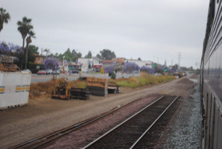Curving into Oceanside. I returned inside but later went back otuside as the train was travelling along the Del Mar Bluffs.