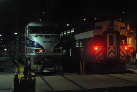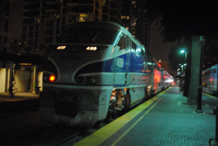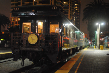 From Old Town, we ran beside the San Diego Trolley and passed a Coaster train heading to Oceanside. We arrived into San Diego on time and after the passengers had all detrained, our cars were spotted at the south end of San Diego station.