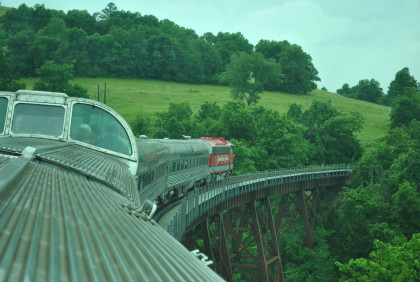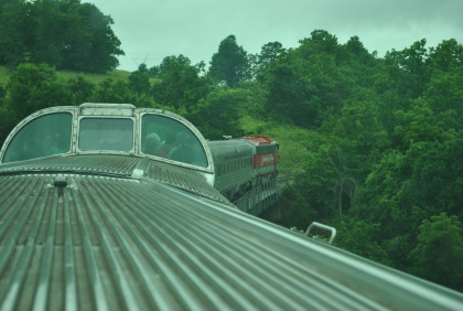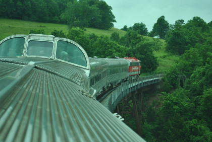 The train crosses Barren Fork Trestle, which is 913 feet long and 125 feet high.