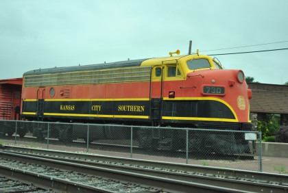 Kansas City Southern F7A 73D built by Electro-Motive Division in 1950. After retirement, it was turned into a slug and retired again then purchased by Peterson Farms and delivered to Decatur in 1991 for restoration.