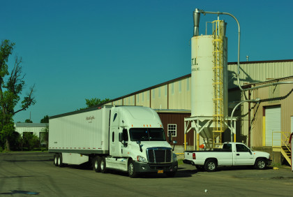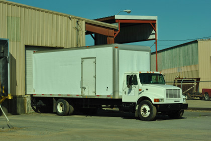 A truck getting ready to leave which we had to stop because his bottle of Windex was on the passenger foot board and the driver had no idea it was there.