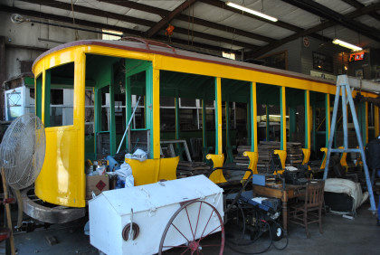 Car 6 is a single truck arched roof 10-bench open car built by Brill in 1906 from Vera Cruz, Mexico under restoration.
