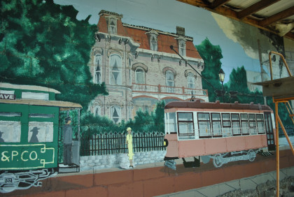 There is a very nice trolley mural on the wall which local artist John Bell, Jr. designed in 1990, and directed a team of his art students in painting it. The mural depicts the 50-year heyday of street railway transportation in Fort Smith, beginning with the mule-drawn streetcars of 1883, on the far left. The second car shown is an open car, in which the motorman stood outside. After that came the semi-convertible trolley and, on the far right, the Birney "safety car," which was used until Fort Smith Light & Traction Co. closed in 1933. Four historical buildings are shown in the background, including Fort Smith's W.H.H. Clayton house and the Fort Smith Art Center.