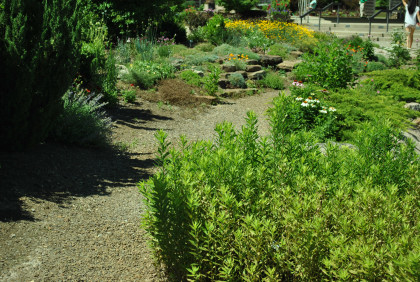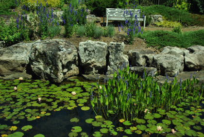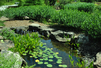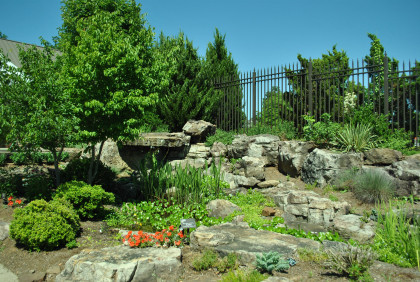 The Rock and Water Garden. A large berm, fieldstone wall and gatehouse separate the public entry from the Rock and Water Garden, which depicts an Ozark mountain stream with grotto effect, waterfalls and pools of water one might see in the mountains. Turtles, frogs and various water plants live in the pools. This garden utilizes custom-blended soils for growing various specialized rock garden plants. The rock featured in this garden is sandstone from the Winslow area.