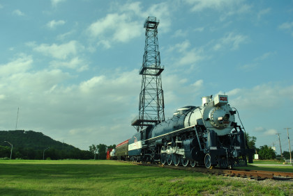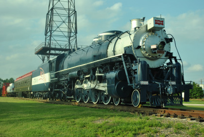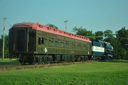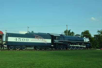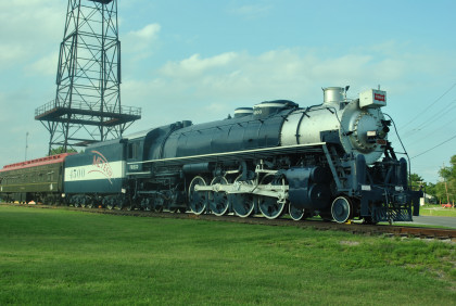 Frisco 4-8-4 4500 built by Baldwin in 1942 and powered the overnight Meteor passenger service from Oklahoma City via Tulsa to St. Louis. 4500 was retired in 1950 and towed to the Frisco Railroad shops in Springfield, Missouri, for a clean-up and re-paint. It was then donated to the City of Tulsa in 1954 and parked in Mohawk Park Zoo until 1991 when it was pulled to the Owasso, Oklahoma rail yard to be renovated. Renovation was slow with most of the work done on weekends by volunteers and it was not until 2011 that work was completed and it was moved to its current location.