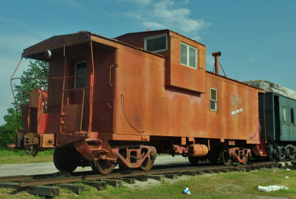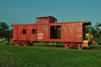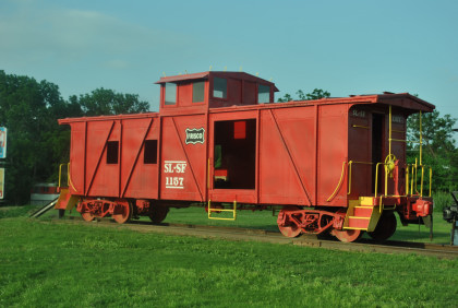 Frisco wooden caboose 1119 built by the railroad. It was acquired from an area family who had used the car as a guest house on their farm.