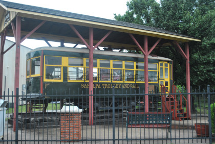 Sapulpa Trolley and Rail Birney safety car 375 built by Wason Manufacturing in 1933. It operated as Tulsa Street Railway 375 from 1927 to 1929 then United Service Company 375 from 1929 to 1933 followed much later by Sapulpa Trolley & Rail 1997-present. It is nicknamed "Maggie M." and lettered Sapulpa Trolley & Rail.