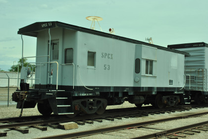 Southern Pacific caboose 53 built by International Car and used on a Qwest cable construction train.