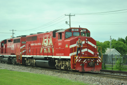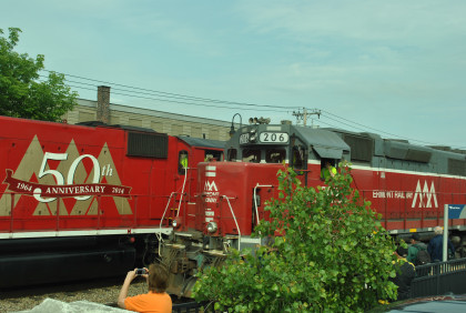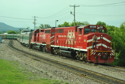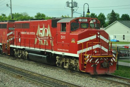 The power for our train, Vermont Railroad GP40-2LW 311 (ex. HLCX 9662, nee Canadian National 9662, built by Electro-Motive Division in 1976) in the 50th Anniversary paint scheme and Vermont Railroad GP40 301 (ex. CSXT 6790, exx. Seaboard 6790, nee Western Railroad of Alabama 703) built by Electro-Motive Division in 1967).