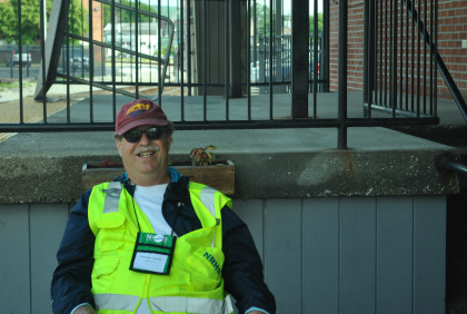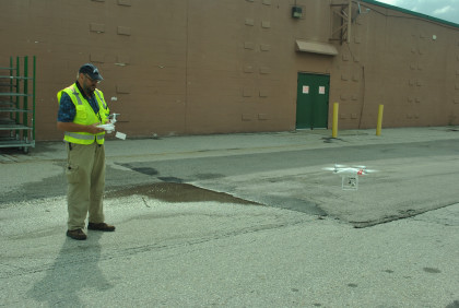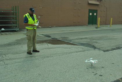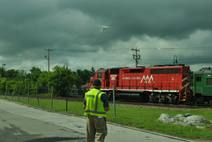 There is a drone in the sky. Steve Barry of Railfan Magazine was getting ready to launch his own drone.