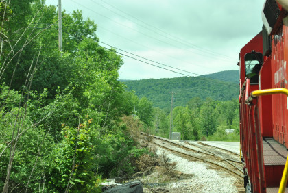 After proceeding only a few feet the train suddenly encountered a washout. Three of the cars started to sway violently. The crew could only helplessly watch as three cars slowly settled lower and lower in the water, as there was no grade left under the ties.