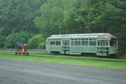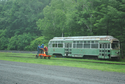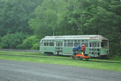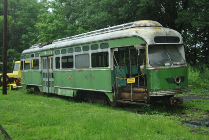 Massachusetts Bay Transit Authority PCC car 3321 by Pullman-Standard in Worcester in 1951. It, along with 3399, ran in Boston for their entire service life from 1951 to 1985. They served primarily on what is now the Green Line. They were then stored for a number of years before being used in an abortive streetcar project in Brooklyn, which left them stored on an exposed pier. They were flooded by Hurricane Sandy and brought to the Museum in 2015. MBTA 3321 is the last trolley car built in Massachusetts.