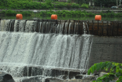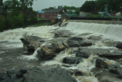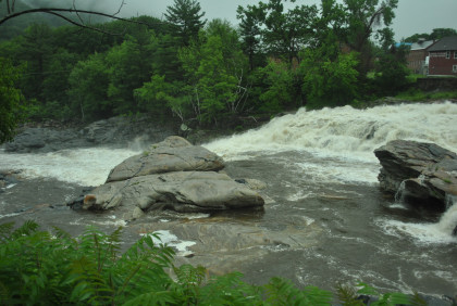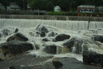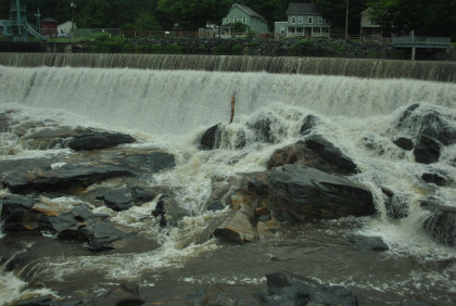 Our last stop was at Shelburne Falls itself, which is a set of low-angle cascades and slides in a sunny, open area. The main falls, at five feet tall, are actually wider than they are tall. The river dumps into a shallow pool of often murky water. The angle of descent is low enough that whitewater kayakers will occasionally run over the falls.