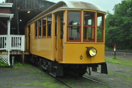 The beautiful Shelburne Falls and Colrain Street Railway suburban combine streetcar 10, built by Wason Manufacturing in 1896.