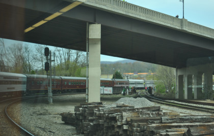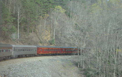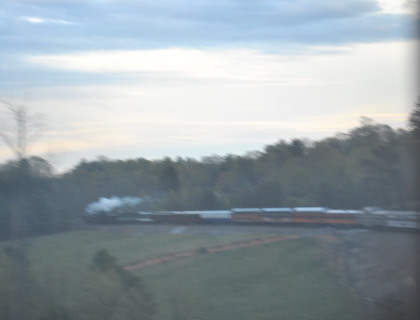 Later the curve near MP 85. Good conversions were had with car attendants and passengers, but we were delayed in our access to the Norfolk Southern mainline in Salisbury. Once there, David and I moved to Car 17 so we could make a quicker escape. We stopped, then Norfolk and Western 611 reversed the train into the North Carolina Transportation Museum grounds and we ended two days of Norfolk and Western 611 trips at our arrival at 10:45 PM.