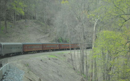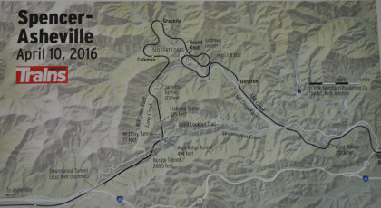 A picture of a map from one of our passengers. Thank you, Trains Magazine, for producing this map. Now the part of the excursion I have always wanted to do, the ride over the Old Fort Loops of the Southern Railway. Designed by Colonel A.B. Andrews and built between 1875 and 1879, the line snakes through the Appalachian mountains between Old Fort and Asheville with a maximum gradient is 2.2 percent - up 2.2 feet and out 100 feet. The rail line is 15 miles long while Interstate 40 is seven miles long. Land was moved to form cuts or fills so the line could maintain the 2.2 percent grade. Since the railroad has to maintain a maximum gradient, it undulates and curves over and around the Appalachian mountains.