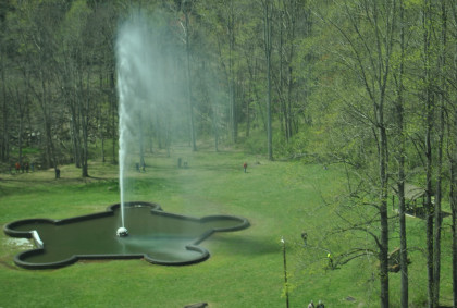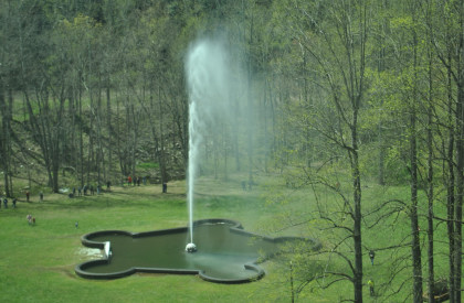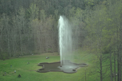 Andrews Geyser shoots water continuously to a height of about 80 feet. Its water supply is drawn from a pond located at the current site of the Inn on Mill Creek, a local Bed & Breakfast. The Inn's property contains the original dam constructed by the railroad in the late 19th century, and the pond formed by the dam with the water of the Long Branch of Mill Creek. A 6-inch-diameter cast iron pipe runs from the dam, through a hidden gate valve, then underground approximately two miles downhill to the fountain. The water comes out a half-inch nozzle pointed skyward, and the 500 feet of elevation difference creates the pressure that drives the fountain.