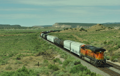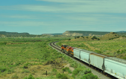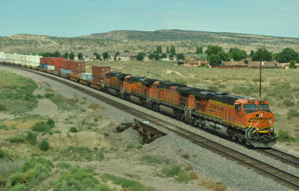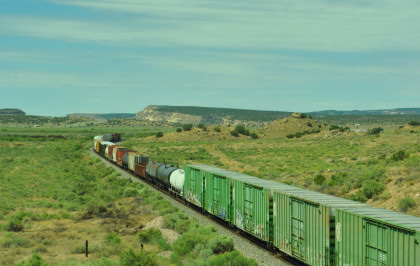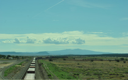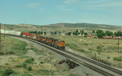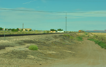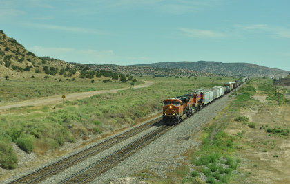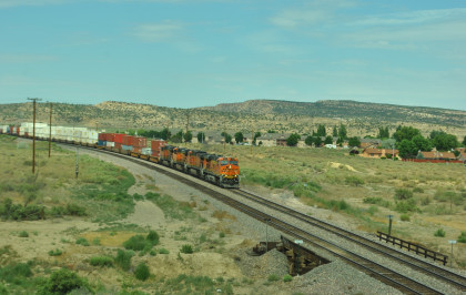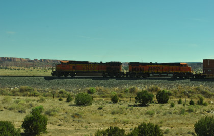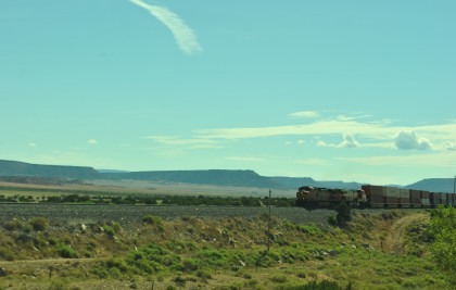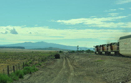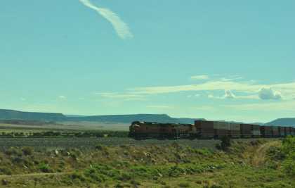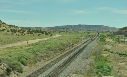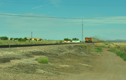 Robin and I slept in this morning because we would gain an hour once we reached the Arizona border. We had breakfast at the Travelodge then packed and loaded the car before checking out and filling the car with petrol for the day. Driving through Grants on old US 66, we looked for trains then drove to Baca Road, turned toward the tracks, parked and saw a green eastbound signal so we waited.