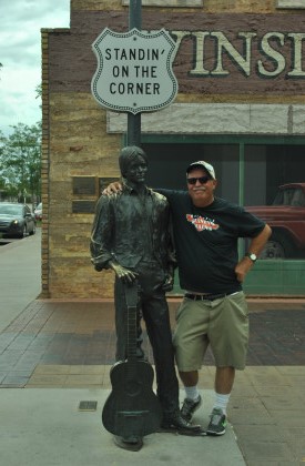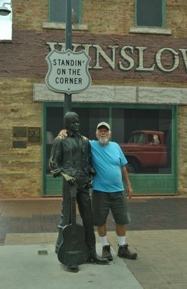 The author beside Standin' on the Corner Park, commemorating the song "Take It Easy" which was written by Jackson Browne and Glenn Frey and most famously recorded by Frey's band, the Eagles. The song includes the verse "Well, I'm a-standin' on a corner in Winslow, Arizona, and such a fine sight to see. It's a girl, my Lord, in a flatbed Ford slowin' down to take a look at me." The park contains a two-story trompe-l'œil mural by John Pugh, a Ford flatbed truck, and a bronze statue by Ron Adamson entitled "Easy" (which resembles Browne, but represents "the troubadour") who is standing on a corner with a guitar by his side. The park is surrounded by a wall of bricks, with windows to peer into; each brick has a donor's name on it, and a story by each of the donors describing their fondness for Winslow, Arizona.