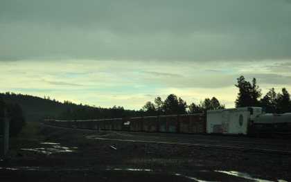 Robin had his turn. We filled the car with petrol and drove west into the afternoon rain, coming upon a big rig which had had a major accident at the Interstate 40/25 interchange, afater which the rain started. We found a train and reached Maine just as one was proceeding east.