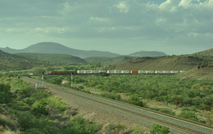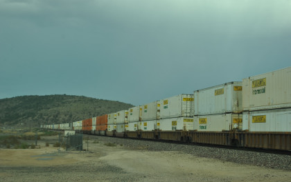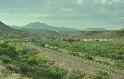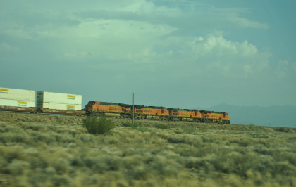 BNSF 6583 West nearing Kingman. We pulled off the highway and called Elizabeth to ask her to make a reservation for us at the Best Western in Needles since I did not want to stay in Kingman in a dust storm. Once on the move again, we caught up and passed that train then crossed the Colorado River and were back in our home state of California. We checked into the Best Western and it was 119 degrees Farenheit when we did.