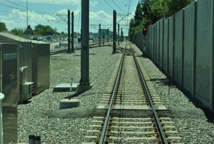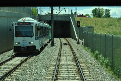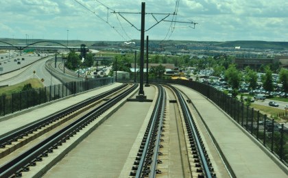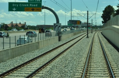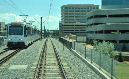 Travelling along the E Line en route to Arapahoe at Village Center station.