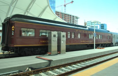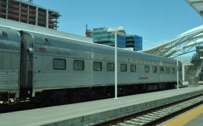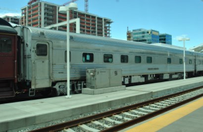 Our rare mileage to the end of track on the E Line. Due to time constraints, it was announced that we would ride the H Line to Nine Mile, which was disappointing to all but as it is a regular Denver Light Rail line, could be ridden at any time. We had an hour for lunch and Elizabeth and I went up on the platform to look around and on the two Amtrak tracks, we found some very special private cars.