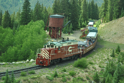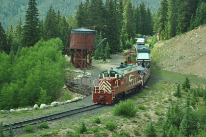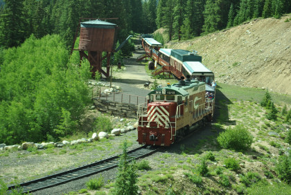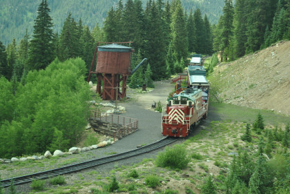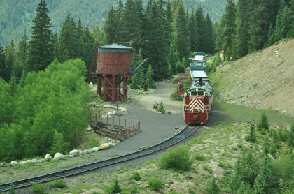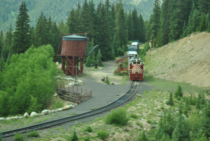 Highway 91 over Fremont Pass. On the way back, Steve Barry and I met with the train crew about the photo runby at the French Gulch water tower and it was decided there would be two runbys so we discussed the procedures for making it a safe experience for the passengers. Steve would take the lower photo line at the first runby and I would take the upper level for both runbys. No passenger could move until the train reversed. After the first runby and the train had reversed, people could then switch either to the upper or lower or stay on the same level. Steve announced it over the train's PA system and when we arrived, I was second off and headed to my appointed spot.