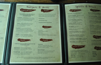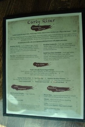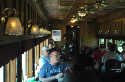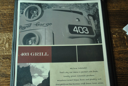 The Royal Gorge Route menu. I made sure Elizabeth was re-hydrated and then finally the train departed Canon City.