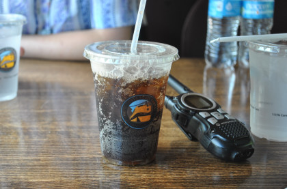 The water truck in case we set fires is running behind the train. My lunch arrived which included chicken tenders and a root beer.