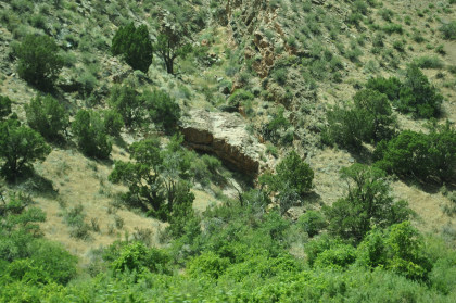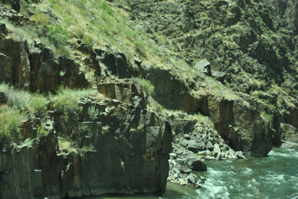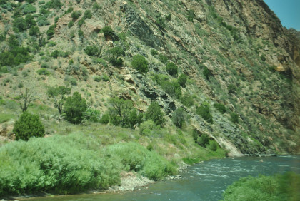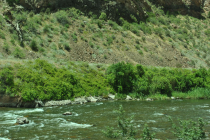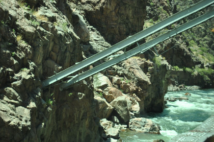 Nearing the Hanging Bridge built in 1879 and located along the north side where the gorge narrows to 30 feet and the sheer rocks walls plunge into the river. Designed by Kansas engineer C. Shallor Smith and built by Santa Fe construction engineer A.A. Robinson for $11,759, the bridge consists of a 175-foot plate girder suspended on one side under A-frame girders that span the river and are anchored to the rock walls. Strengthened over the years, the bridge remains in service today.