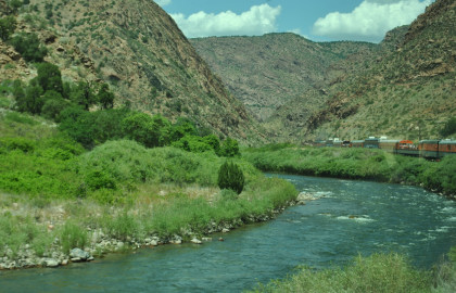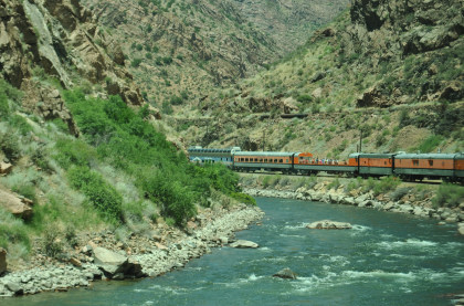 HistoryIn the late 1870s, miners descended on the upper Arkansas River valley of Colorado in search of carbonate ores rich in lead and silver. The feverish mining activity in what would become the Leadville district attracted the attention of both the Rio Grande and Santa Fe railroads, each already having tracks in the Arkansas valley. The Santa Fe had tracks in Pueblo and the D&RG had tracks near Canon City, Colorado, some 35 miles west. Leadville was over 100 miles away through the "Grand Canon of the Arkansas," a mountain valley 50 miles in length at a consistent and railroad-friendly water grade of one per cent. For two railroads to occupy a river valley ordinarily was not a problem, however, west of Canon City the Arkansas River cuts through the Royal Gorge, a high plateau of igneous rocks forming a spectacular steep-walled gorge over a thousand feet deep and six miles long. At its narrowest point sheer walls on both sides plunge into the river, creating a nearly impassable barrier. Sharing is not an option along this route.