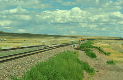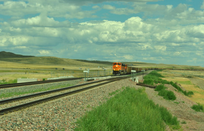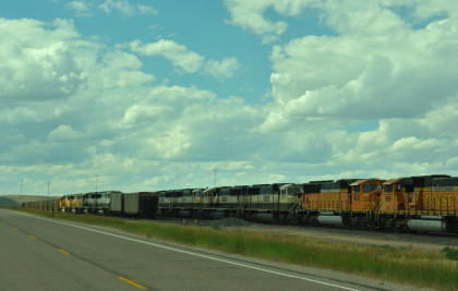 A long line of stored BNSF power, one of two at the Donkey Creek yard. We drove east, saw a headlight and turned on the first road we could.