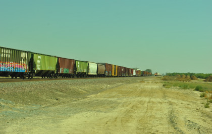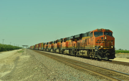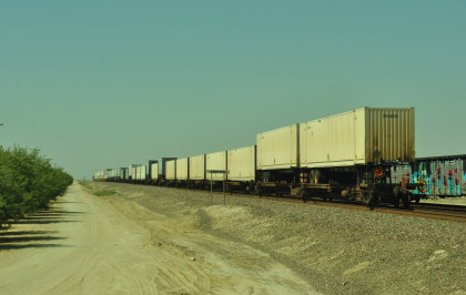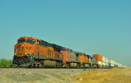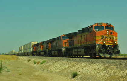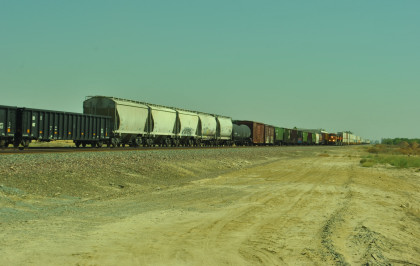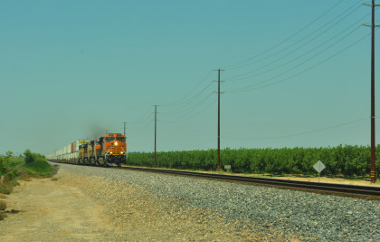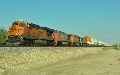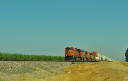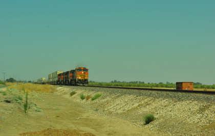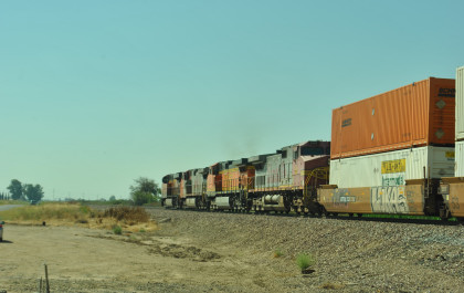 8/13/2016 My mother and I ate breakfast at the hotel, checked out and drove back to Escalon where I filled the car with petrol. Just east of town, a westbound BNSF freight passed one in the siding.