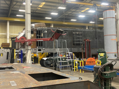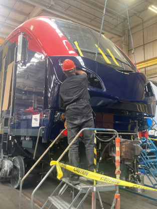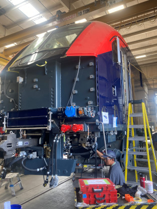 An employee working on a new SCC-44 locomotive for Amtrak.