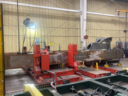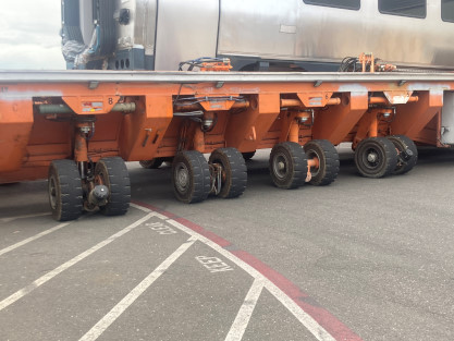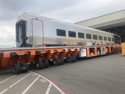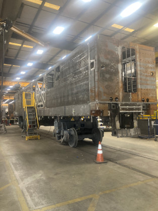 The continuation of the Venture coach being moved into the next shop to be worked on. The wheels of the huge railcar mover turned in different directions to 'steer' it into the building and the whole process was carefully monitored by watchful employees.