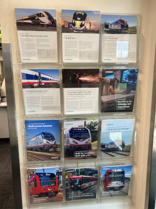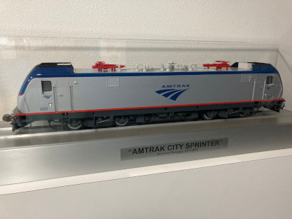 Model of Amtrak City AC-44 Sprinter 601 on display near an elevator in the headquarters building. As we walked through the corridors with offices and workstations, there were several photographs of Siemens-built equipment representing the cities in which their products operate.