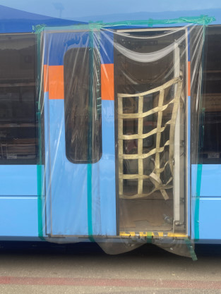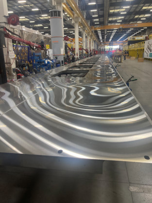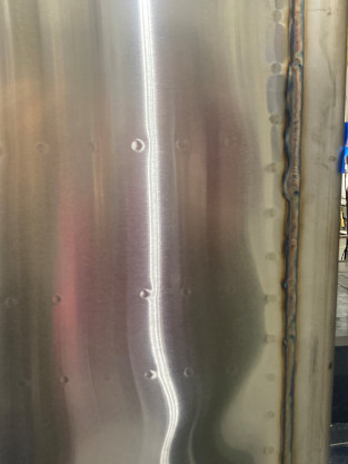 Side of the coach's steel panels. The wavy lines are the reflection of the overhead lights.