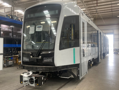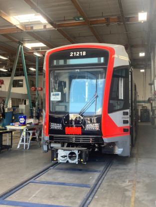 San Francisco Metropolitan Transit Agency streetcar 2126, built by Siemens in 2022 and on a shop stand.