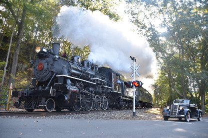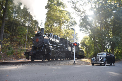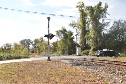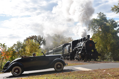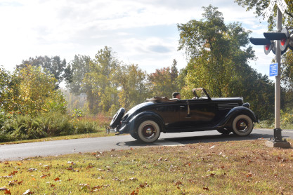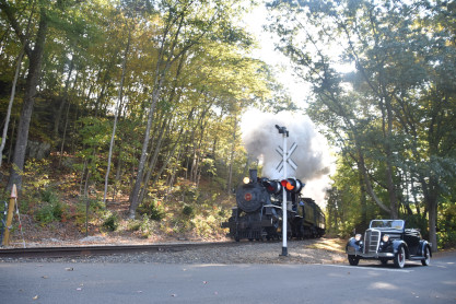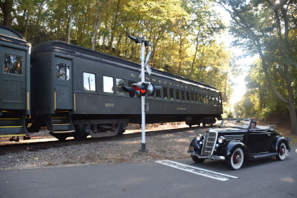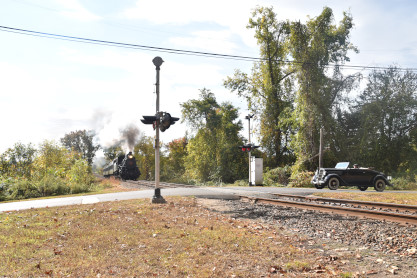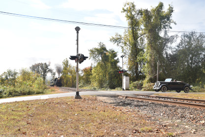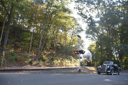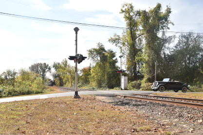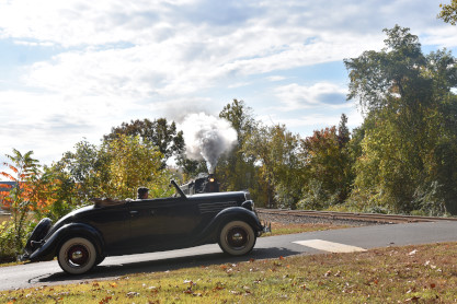 The engine reversed onto the point of our train, everyone boarded and soon we were off to our first set of photo runbys at Deep River Road, Milepost 4.5, featuring a 1930's Ford Cabriolet.