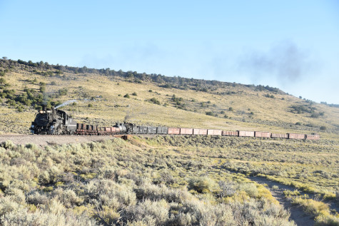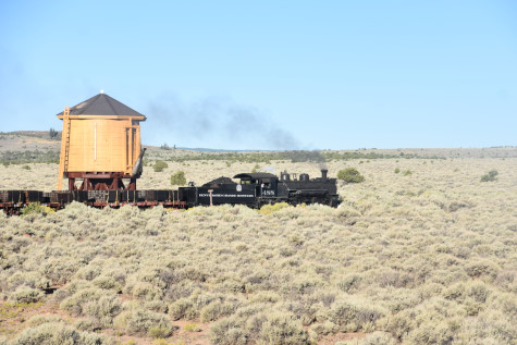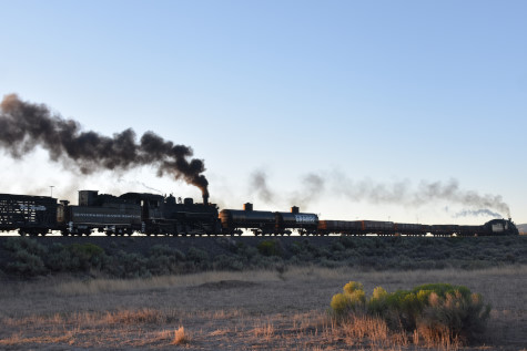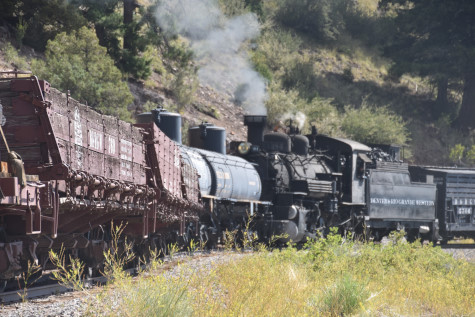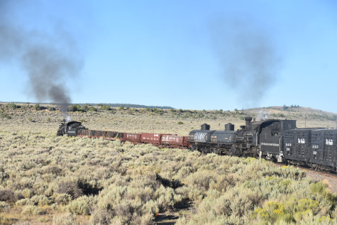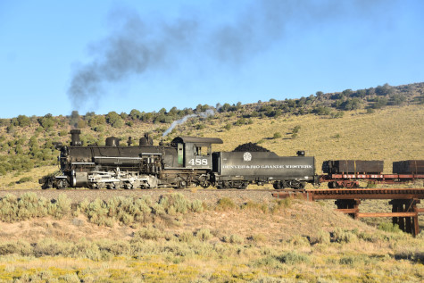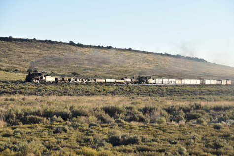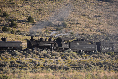 This was the last of the three-day photo charter organized by Dak Dillon in celebration of the 100th anniversary of the K36 locomotives. Today's photo freight would journey through rugged high desert, canyon walls and historic tunnels with the experience of the dramatic transition from high desert to towering rock walls as our K-36 locomotive power through the most diverse terrain on the entire line. This special excursion travelled through steep-walled canyons, navigated two historic tunnels and offered spectacular vistas of the surrounding landscape. For authenticity, the steam locomotives and rolling stock had been lettered "Denver and Rio Grande Western" for these charters.