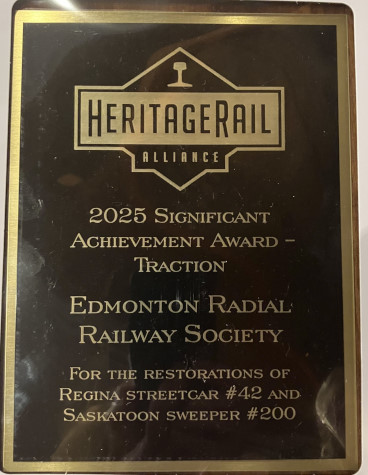 Edmonton Radial Railway Society for the restorations of Regina streetcar 42, ex. Canadian Railway Museum 24 1964-1987, exx. Canadian National 15702 1924-1964, nee Toronto Suburban Railway 24 1913-1924, built by Preston Car and Coach in 1913 and Saskatoon sweeper 200, ex. Western Development Museum 200 1951-1986, exx. Saskatoon Transit System 200 1949-1951, nee Saskatoon Municipal Railway 200 1913-1949, built by Ottawa Car Manufacturing Company in 1907.