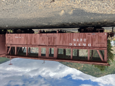Denver and Rio Grande Western drop-bottom gondola 871, built by American Car and Foundry in 1904. The 800 series originally had slatted coke racks that raised their sides to the height of boxcars. In 1918, the coke racks were removed, six-inch side boards were added, the lever systems were altered, and under frames were stiffened with steel. Drop-bottom gondolas carried bulk material such as ore, coal, coke, sand, ballast and rock. The unique hinged unloading floors on these cars were activated by a complex mechanism of shafts, levers and chains. Before drop bottom cars were invented, material was shovelled out by hand.