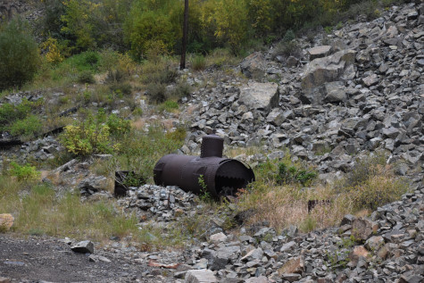 A boiler from a steam engine beside the right-of-way.