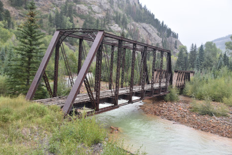 Crossing the Animas River on the steel-trussed Tefft bridge at MP 477.80.