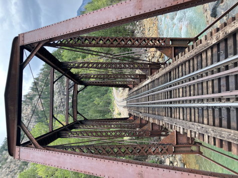 Crossing the High Bridge, Milepost 471.23. The current bridge was reinforced in 1981 to support the heavier K-36 series of locomotives {480's} that Charles Bradshaw, Jr. wanted to use on the line.