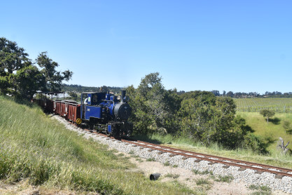 Freight train photo runby fourteen, being paced by a restored farm truck. Two of the railway's volunteers rode the freight train throughout the day for braking reasons; this particular instance, Peter Nott rode.