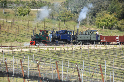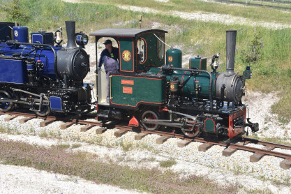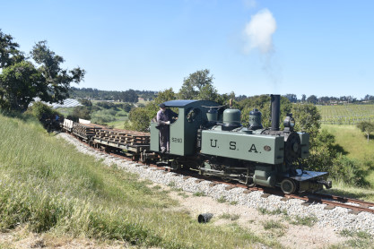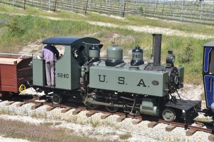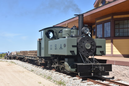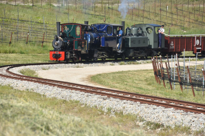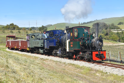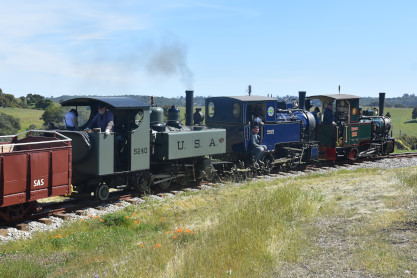Norgrove Railway 0-4-0T 6 "Buckeye" in the lead, Norgrove Railway 0-4-0T 8 in second and United States Army 2-6-2T 5240 bringing up the rear.