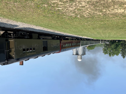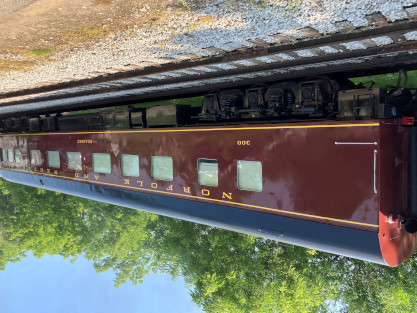 Norfolk and Western observation car 300 "Roanoke" built by Pullman in 1917. It was modernized by the Roanoke Shops in 1955, repainted and assigned the name "Roanoke" on October 15th, 1977. It was then re-nenumbered NS 5 on paper, but not the car itself, on December 2nd, 1985 then deemed surplus and sold at auction in 1987. It was rebuilt to Amtrak standards at Eastern Rail Services in 1988 and placed into warehouse storage in 1991. In 2019, it was acquired by the Norfolk and Western Business Car 300 Preservation Society, Inc. The train reversed for another photo runby.
